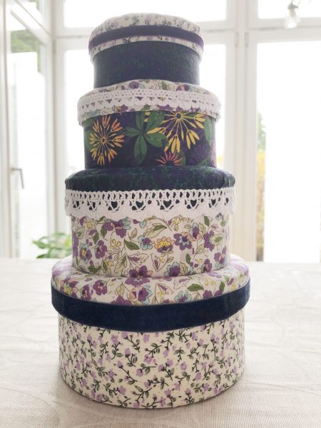 Patchwork-Stoffe verzaubern die Schachteln in vier verschiedenen Mustern!